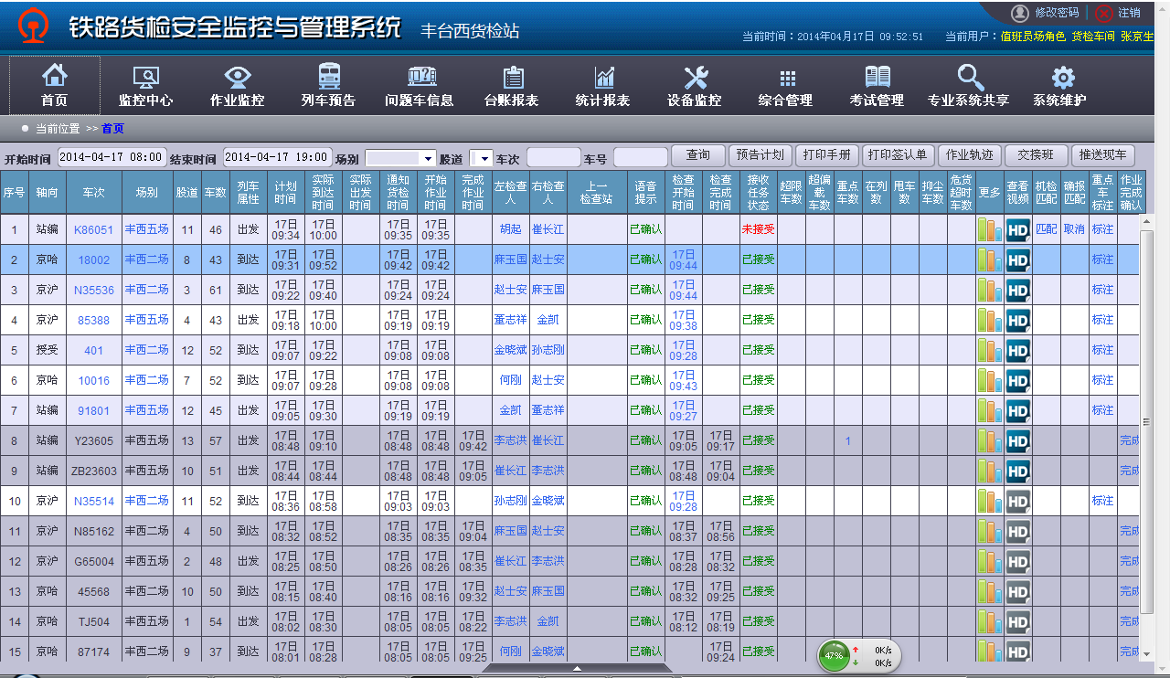 有货检作业的车站,一般成立了货检车间。该货检车间工作及管理人员使用的《铁路货检安全监控与管理系统》是全国铁路统一开发和使用的软件系统。成都货安计量技术中心有限公司是该软件系统的重要开发参与者和运维者。目前该系统已经在全路投入使用,并实现了三级联网,搭接在该系统中实现数据交换的有:安全门监控系统、轨道衡和超偏载系统、货检员现场作业看车时手持机系统等。